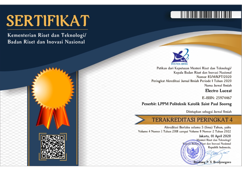 Merupakan salah satu Jurnal Publikasi Ilmiah hasil penelitian bidang Teknik Elektro, Teknologi Rekayasa Listrik, Bidang Teknik Komputer Jaringan dan Rekayasa Teknik Elektro lainnya. Jurnal Electro Luceat sejatinya telah diterbitkan sejak tahun 2011 dalam bentuk hardopy/cetak yang tersimpan di Perpustakaan Politeknik Saint Paul Sorong, namun sejak Tahun 2015 JEC menerbitkan jurnal selain cetak/hardcopy juga dipublikasikan secara online.